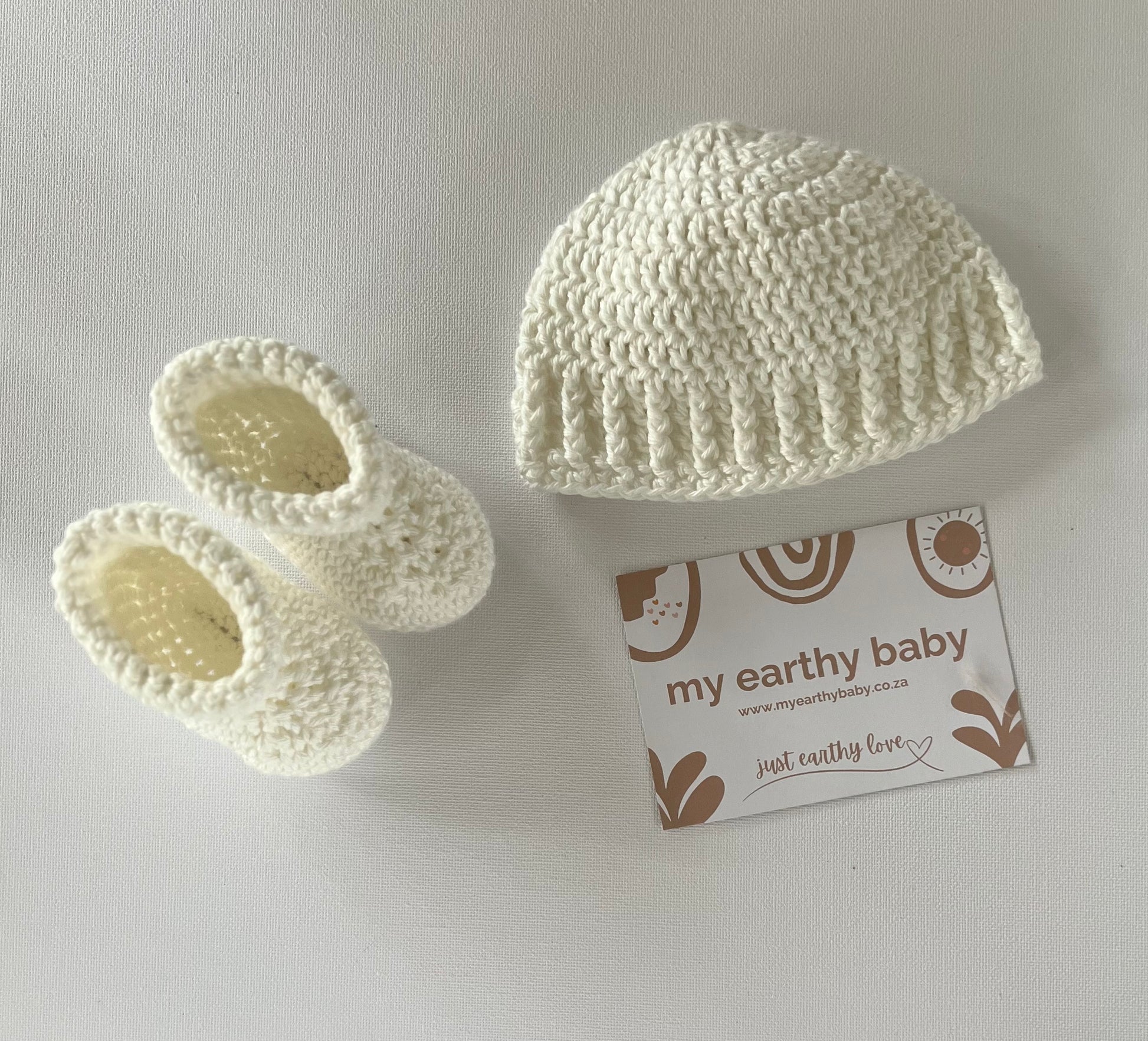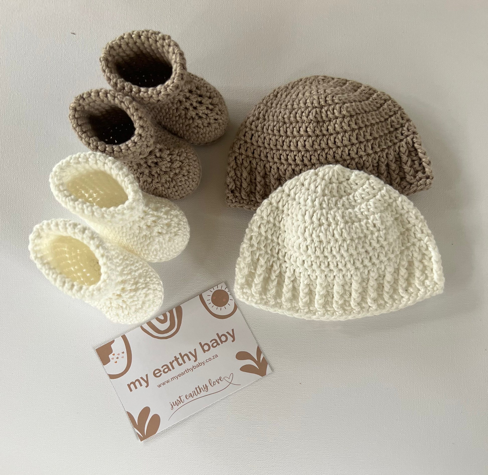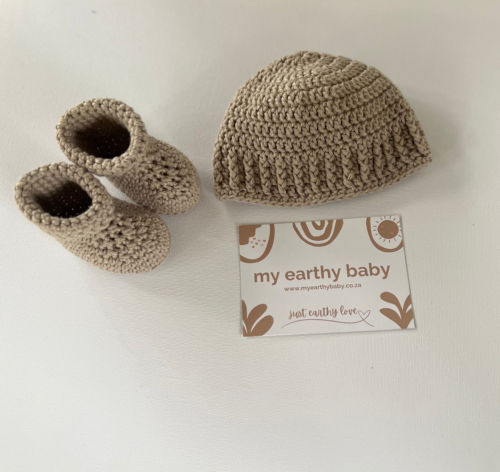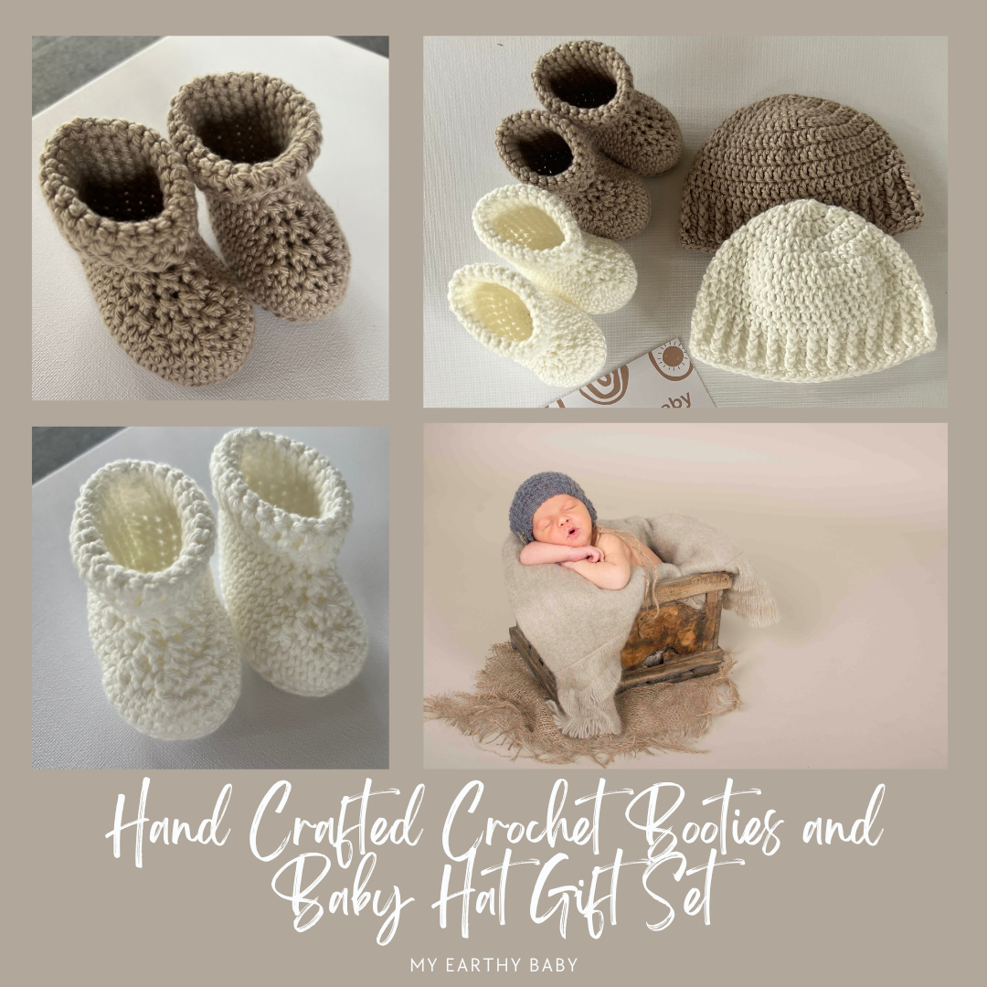 Beautiful, hand-crafted bespoke newborn baby sets individually crocheted in Earthy Colour tones suitable for both genders. This set includes a pair of baby booties and hat and is ideal for that special Earthy Family Photo Shoot with your newborn.